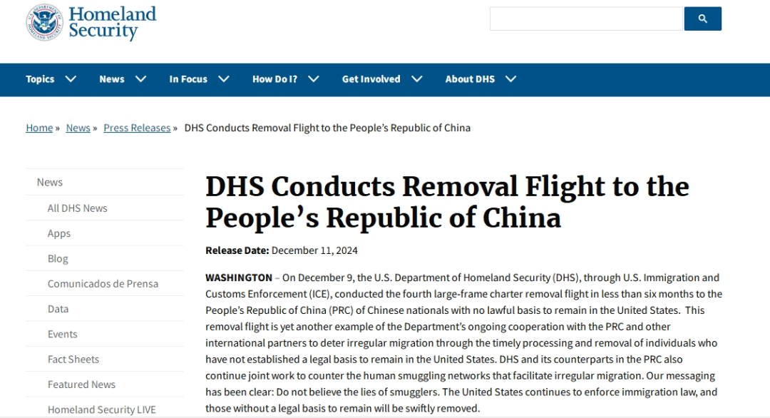 根據(jù)美國國土安全部12月11日發(fā)布的消息,12月9日,通過美國移民和海關(guān)執(zhí)法局包機(jī)遣返了一批中國移民。