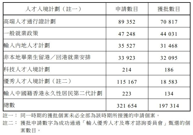 根據(jù)香港立法會的文件,截至2024年6月底,香港各項人才入境計劃收到321,654份申請,其中197,314份申請已獲批。